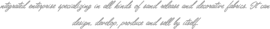 從事各類(lèi)沙發(fā)布、裝飾布的工貿(mào)一體化企業(yè),可自行設(shè)計(jì)、開(kāi)發(fā)、生產(chǎn)、銷(xiāo)售。